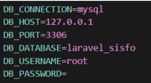 Selanjutnya, buka direktori proyek menggunakan code editor pilihan Anda. Setelah itu, periksa file .env untuk memastikan konfigurasi database sudah sesuai. Jika menggunakan localhost, pengaturannya kurang lebih akan tampak seperti berikut: