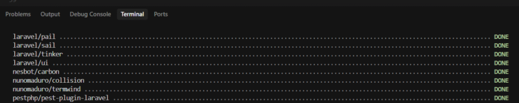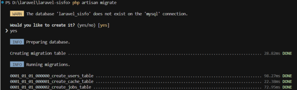 Setelah semua komponen terpasang, langkah selanjutnya adalah melakukan migrasi database atau membuat database baru agar proyek dapat terhubung dengan MySQL. Jalankan perintah berikut: