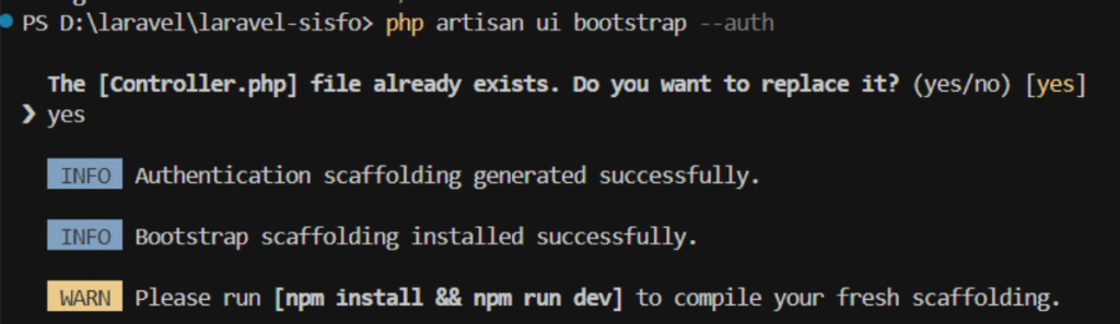 Setelah itu, kita akan menambahkan fitur Authentication ke dalam proyek dengan menjalankan perintah berikut: