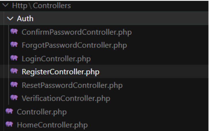 Fungsi dari instalasi menggunakan Node.js dan npm adalah untuk memasang serta mengompilasi berkas-berkas aset bawaan. Dengan menjalankan perintah tersebut, file-file yang diperlukan untuk fitur autentikasi akan dibuat secara otomatis, seperti halaman login, registrasi, dan lupa kata sandi. Selain itu, controller autentikasi juga akan digenerate, seperti yang ditunjukkan pada gambar berikut: