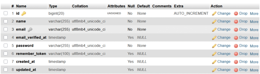 Laravel juga secara otomatis membuat tabel users yang menyimpan informasi data pengguna. Berikut adalah struktur dari tabel users tersebut.