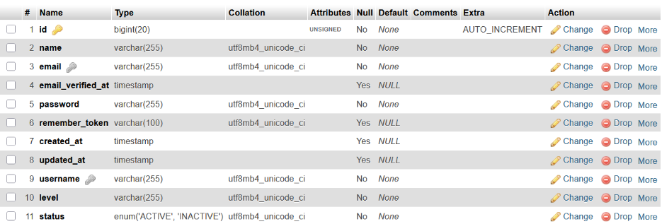 Jika berhasil, maka tabel users di database akan bertambah kolom username, level, dan status sesuai dengan yang ada digambar
