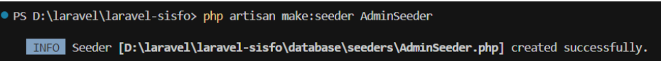 Jika perintah berhasil, maka file seeder baru akan dibuat di folder database/seeders dengan nama AdminSeeder.php. seperti berikut