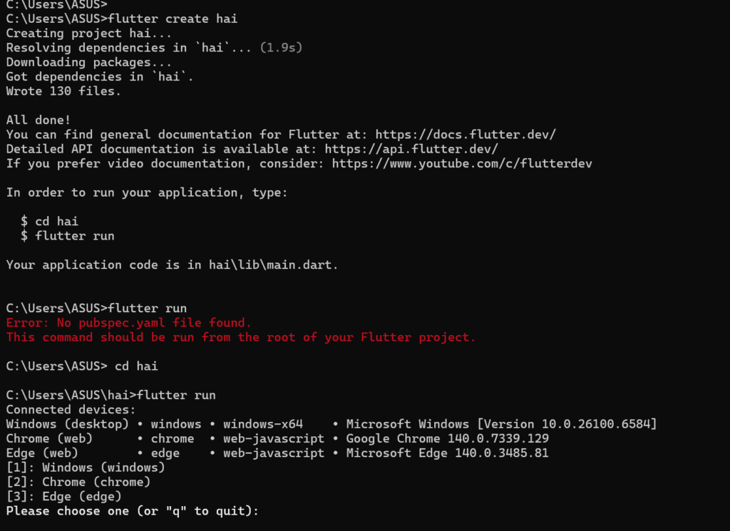 dan untuk mengetes project flutter yang sudah dibuat, pergi ke folder tersebut dan gunakan perintah flutter rununtuk menjalankan project: