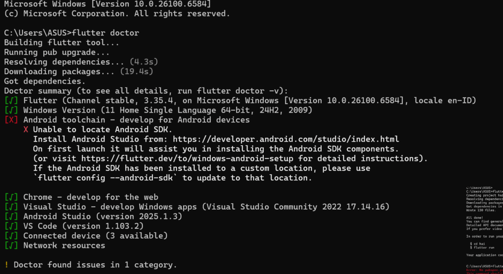 kemudian setelah semua ter-install buka terminal dan jalankan flutter doctor