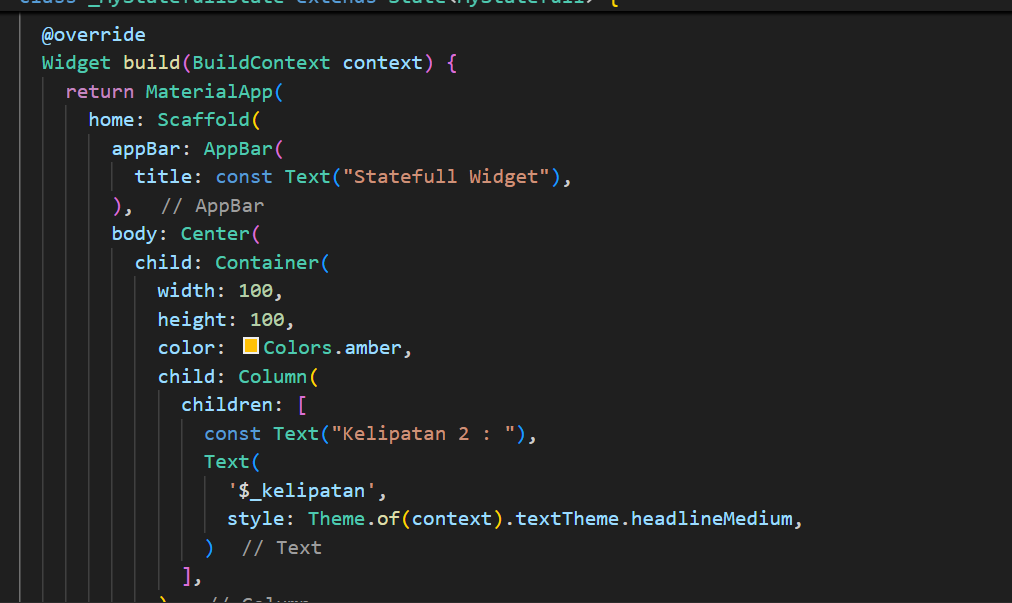 Selanjutnya adalah membuat Statefull. Statefull Widget merupakan widget dinamis yang ketika sebuah state berubah maka tampilan UI juga berubah. contohnya ketika tombol diklik atau ditekan maka tombol berubah warna atau form input nilainya berubah