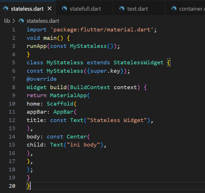 Untuk mencobanya, buat sebuah class baru di dalam folder lib dengan nama stateless.dart, kemudian tambahkan kode program berikut.