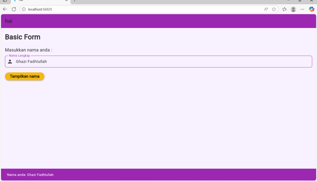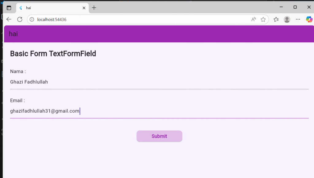 Ketika tombol ditekan, fungsi onPressed akan dijalankan. Pertama, dilakukan pengecekan validasi dengan if (_formKey.currentState!.validate()). Jika semua field valid, maka isi dari TextEditingController dibaca dan disimpan ke variabel name dan email. Nilai-nilai tersebut kemudian ditampilkan ke pengguna menggunakan ScaffoldMessenger.of(context).showSnackBar(), yaitu komponen Flutter yang menampilkan notifikasi kecil di bagian bawah layar. Pesan yang ditampilkan berupa “Nama: [nama]” dan “Email: [email]”, dengan latar belakang berwarna ungu agar konsisten dengan tema aplikasi.
