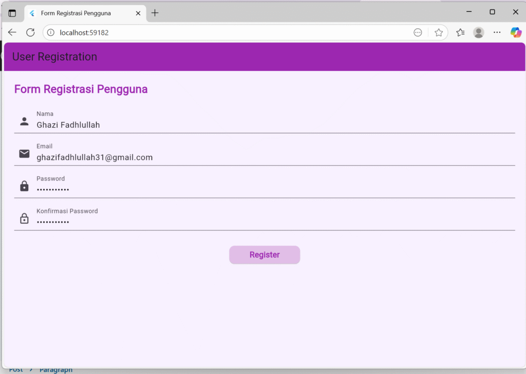 Kode di atas merupakan implementasi aplikasi Flutter sederhana yang menampilkan form registrasi pengguna dengan beberapa input seperti nama, email, password, dan konfirmasi password. Aplikasi ini juga menggunakan validasi input serta menampilkan notifikasi berupa SnackBar ketika data berhasil dikirim.